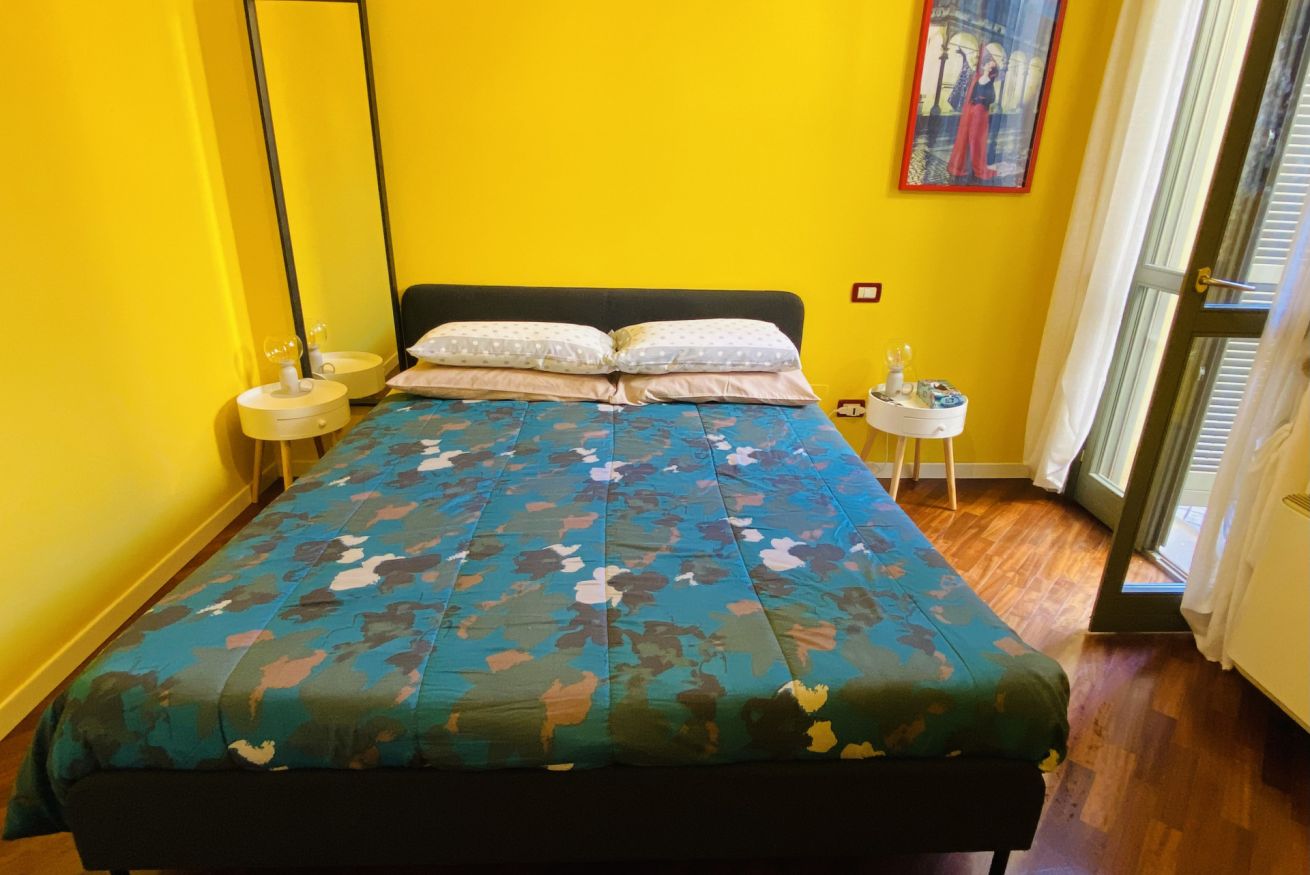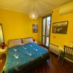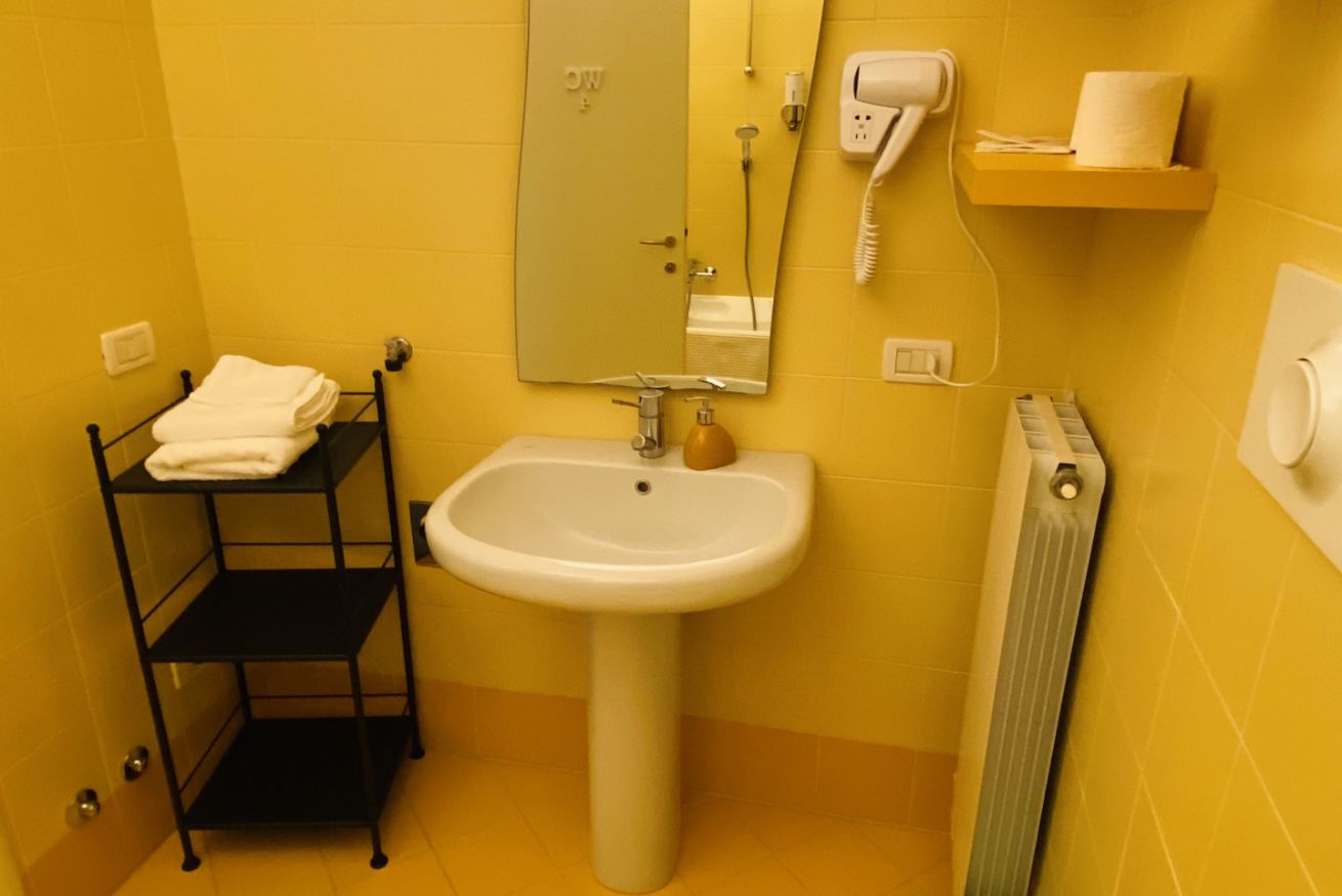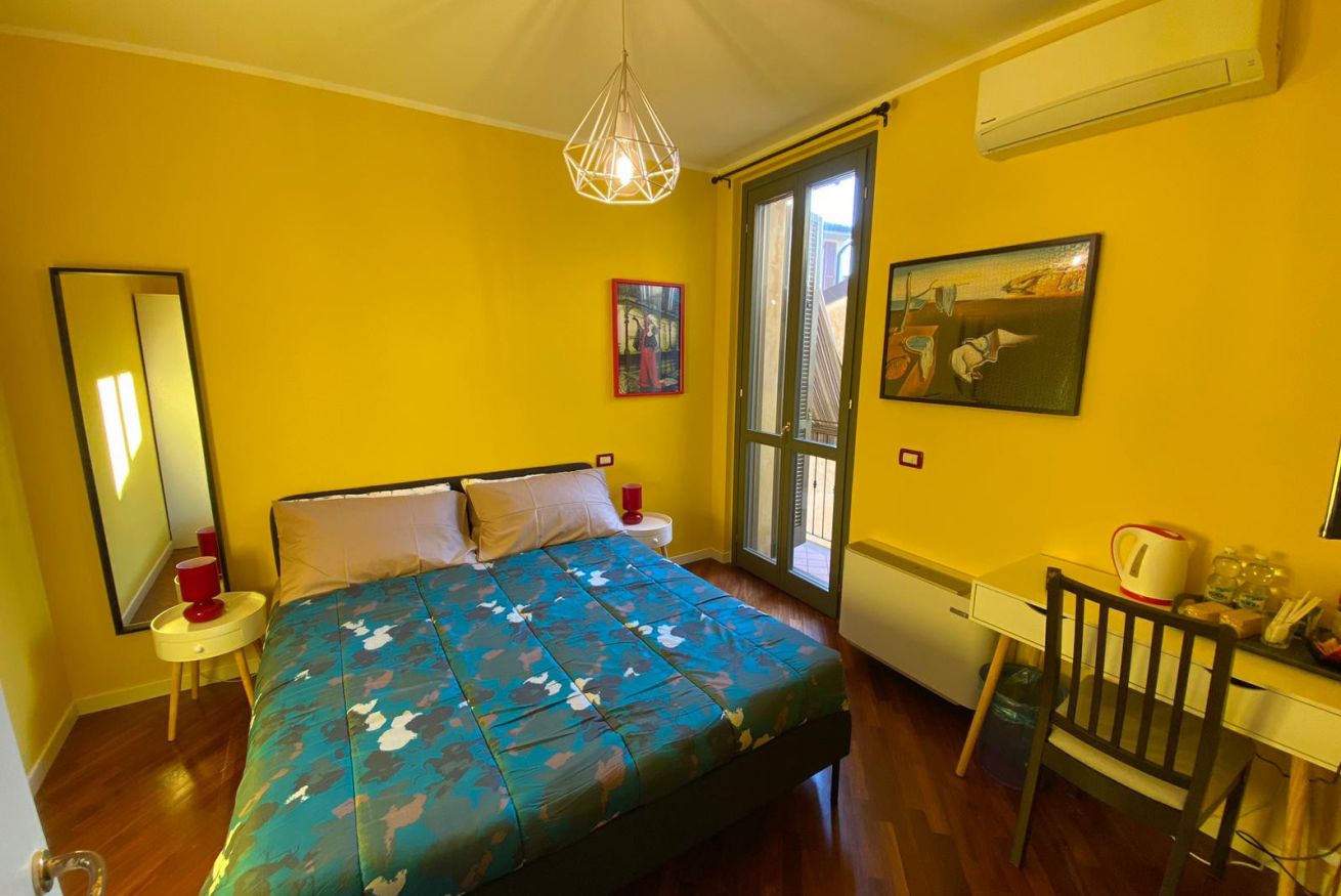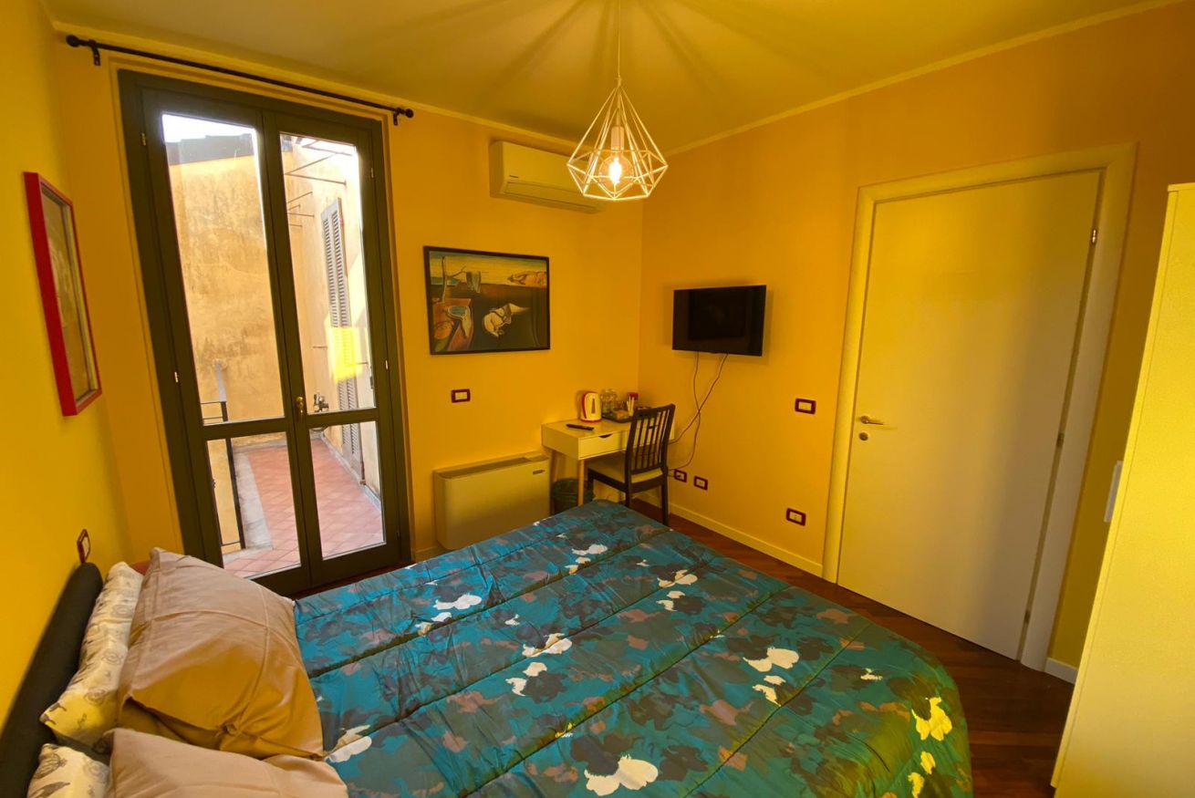 Camera dotata di un letto matrimoniale, aria condizionata e riscaldamento, armadio, scrivania con luce e connessione wi-fi in fibra ottica. Bagno ad uso privato esterno fronte camera.