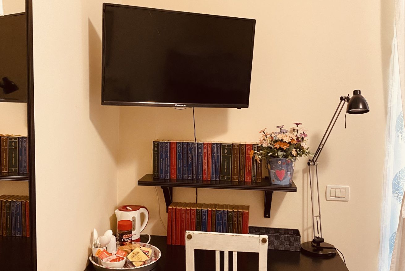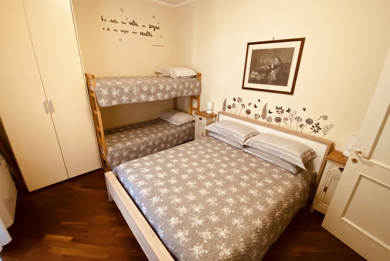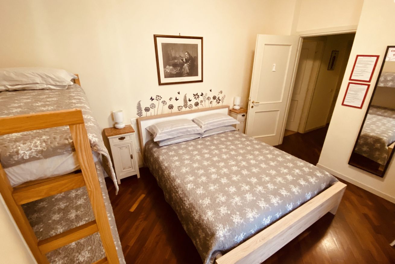 Camera dotata di un letto matrimoniale e un letto a castello, aria condizionata e riscaldamento, armadio, scrivania con luce e connessione wi-fi in fibra ottica. Bagno ad uso privato esterno lato camera.